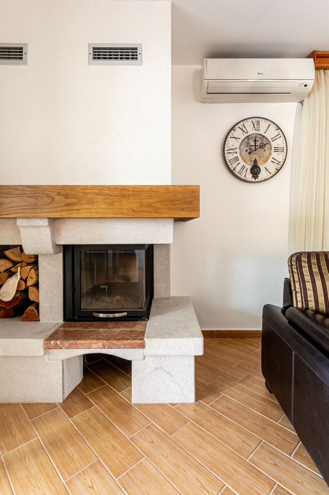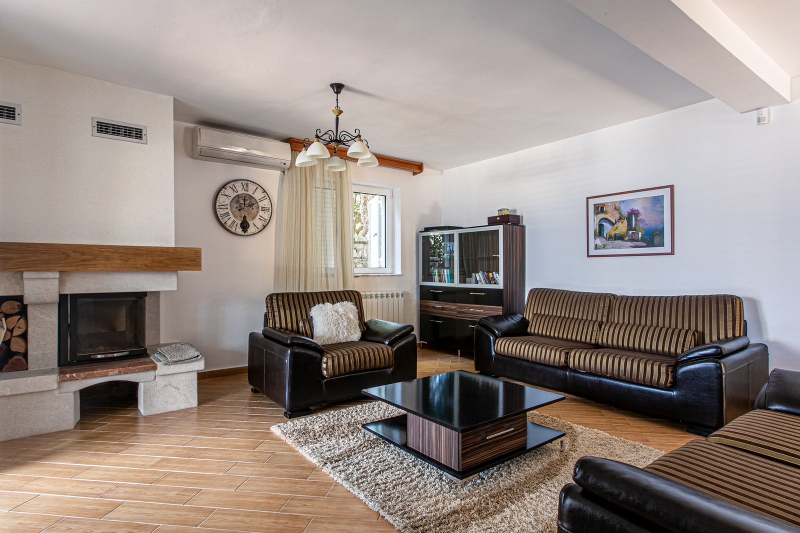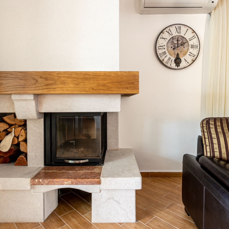 On the 3rd level there is another very large room with its own bathroom, to be used as another Main bedroom with lounge area and bathroom or as a family room, again with epic views. This villa ensures ample space for everyone to relax and rejuvenate. The living area boasts a snug fireplace, perfect for those cooler evenings.