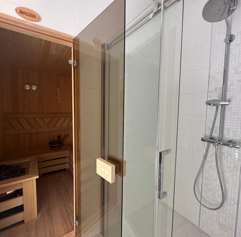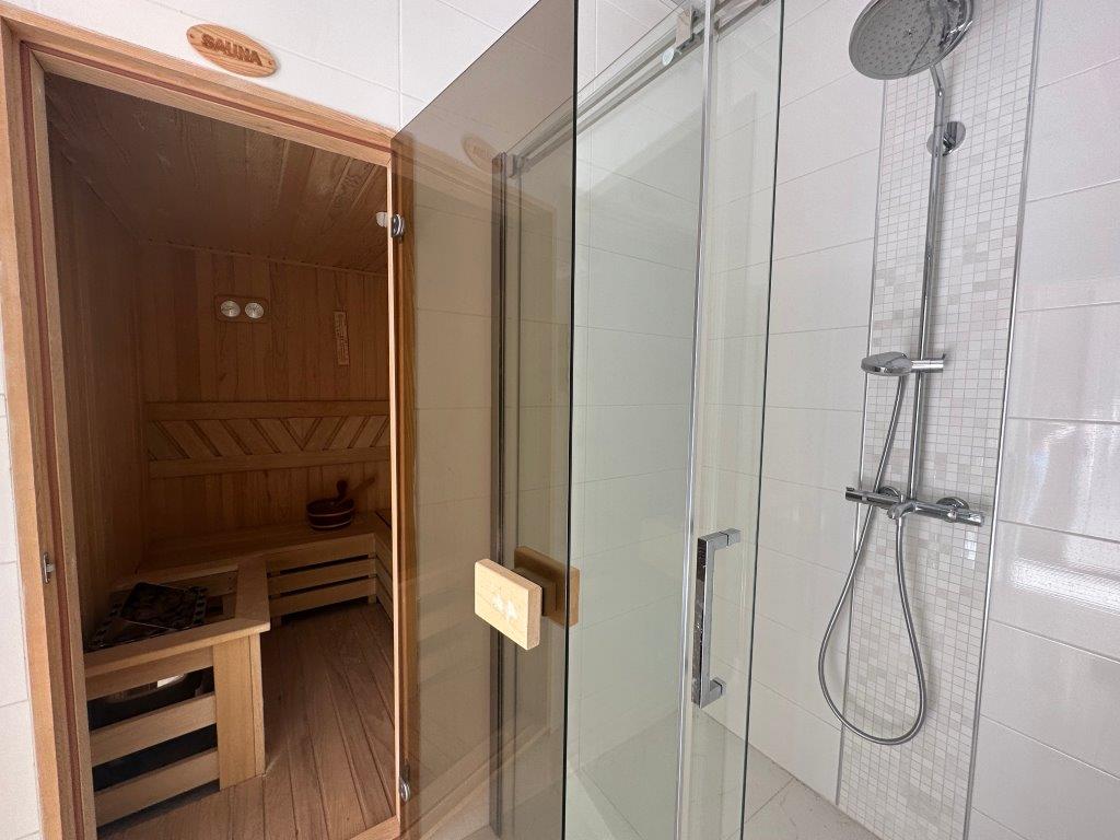 The villa boasts a comfortable contemporary interior, featuring designer furniture that enhances the overall ambiance. The first floor comprises a spacious lounge, a dining area, and a kitchen with direct access to the pool area. You’ll also find a sauna with a shower on this floor. The second and third floors are home to the master bedrooms, each with private bathrooms and stunning sea views.